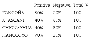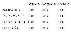 Las tablas 1 y 2, muestran las posturas de los pobladores, la comunidad que tiene una posición positiva respecto a los inicios del proyecto es Pampahuasi con 80% y 70 % Pongoña y Hanccoyo, por el contrario, Ccochapata, Ccotaña, K´ascani y Chignayhua, tienen un punto de vista relativamente negativo siendo la más considerable Ccochapata en 90%. Así también Toccoccori se encuentra aún indecisa con 50%. Por lo tanto, el contacto inicial no era de negación absoluta, por el contrario, según los datos la mayoría de los sectores tenía perspectivas dubitativas que podía modificarse.
