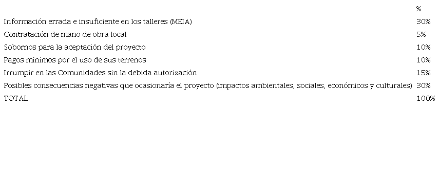 El primer punto estuvo relacionado con los trabajos y talleres informativos, que fueron tergiversados y poco objetivos. Mostrando datos erróneos de cada sector en relación a: población, flora, fauna, hídricos, aspectos sociodemográficos, económicos y salud. Conllevando al descontento y rechazo popular.