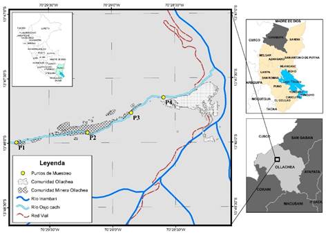 El estudio se realizó durante el mes de mayo del 2019 en la Comunidad Minera de Ollachea (CMO), que forma parte de la Comunidad de Ollachea (CO), en la provincia de Carabaya del departamento de Puno - Perú (figura 1), por esta zona transcurre el río Osccocachi, cuyo nacimiento se encuentra en la cuenca Inambari, a una altitud de 4662.9 msnm, siendo uno de los afluentes del río Ollachea. La geología del área de estudio proviene del dominio geotectónico del altiplano oriental (Díaz-Martínez et al., 2001), de la era del Mesozoico con un sistema jurásico donde predominan rocas intrusivas como la Sienita nefelínica (Gobierno Regional de Puno [GRP], 2015). Las principales actividades económicas de la población son la agricultura (Dirección Regional Agraria Puno [DRAP], 2014), la minería subterránea (Cesar, 2019) y el comercio industrial que abastece a estas actividades con materiales e insumos. En un tramo de 2.31 km, a ambos márgenes del río Osccocachi, se desarrolla de forma intensiva la minería de categoría artesanal, por lo que existe un crecimiento económico y social considerable en la población de la CO, compuesta por 6174 habitantes (INEI, 2017).