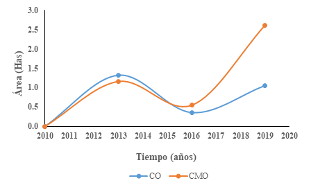 La figura 2 muestra que el área ocupada por la CO en el 2010 fue de 16.4 has, con un crecimiento territorial de 2.7 has al 2019. Los años que presentaron mayor y menor crecimiento fueron el 2013 (1.3 has) y 2016 (0.4 has), respectivamente. Por otra parte, la CMO presentó un área de 7.5 has en el 2010, cuya expansión territorial al 2019 fue de 4.3 has. El año de mayor expansión se registró en el 2019 (2.6 has) y el menor en el 2016 (0.5 has). Esto estaría relacionado con la emisión del Decreto Legislativo N° 1105 (Instrumento de Gestión Ambiental Correctivo - IGAC), el cual establece el procedimiento de formalización de las actividades mineras a pequeña escala (Decreto Legislativo N° 1105 - Decreto Legislativo Que Establece Disposiciones Para El Proceso de Formalización de Las Actividades de Pequeña Minería y Minería Artesanal, 2012).