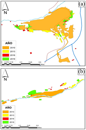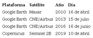 Se obtuvieron imágenes satelitales multitemporales de la CO y CMO con intervalos de tres años desde el 2010 hasta el 2019, mediante el sistema de información geográfica Google Earth y la plataforma Copernicus (tabla 1). Las imágenes fueron ajustadas con 20 puntos de control fijos en el tiempo. Las áreas de la CO y CMO fueron digitalizadas manualmente y cuantificadas con la metodología propuesta por Jampani et al. (2020), utilizando el software ArcGis 10.8.