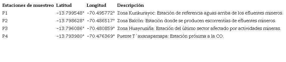 Se establecieron cuatro puntos de muestreo (tabla 2) aguas abajo del río Osccocachi, siguiendo la metodología establecida por el Protocolo Nacional para el Monitoreo de la Calidad de los Recursos Hídricos Superficiales (Autoridad Nacional del Agua [ANA], 2016), el cual sugiere evaluar un afluente antes, durante y después de una determinada actividad industrial. Se determinó la temperatura (T) en °C, conductividad eléctrica (CE) en uS/cm, pH y potencial óxido-reducción (POR) en mV utilizando un multiparámetro HANNA (HI98204, USA). Para la calibración del equipo se utilizaron buffers de pH 4.01, 7.01 y 10.01 de la marca HANNA y soluciones de referencia para CE de 12.88 uS/cm y 147 uS/cm de la marca HACH. Se registraron los valores correspondientes a una temperatura ajustada de 25 °C durante 5 días consecutivos a razón de 5 réplicas por día, evaluando la repetibilidad aplicando las pruebas de Bartlett y ANOVA de un factor. Se elaboraron cartas de control para validar la estabilidad del proceso de mediciones que permita garantizar la calidad y el control (QA/QC) de los monitoreos.