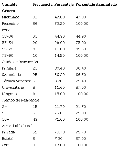 En la tabla 5 se observa el análisis exploratorio de las variables sociodemográficas básicas, las cuales muestran que el 52.2% de la población encuestada que decidió participar fueron mujeres y el 47.8% fueron varones; el rango de edad predominante de los participantes se encontró dentro de 18 a 54 años (73.9%). Además, predominan los grados de instrucción primaria y secundaria en un 66.7% de los participantes. El 71% de los encuestados respondieron que radican en la CO por más de 10 años y que su actividad laboral se desarrolla en el sector privado (79.7%).