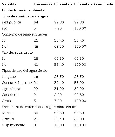 Sobre el contexto socio ambiental (tabla 6), un gran porcentaje de los participantes respondieron que consumen el agua proveniente de la red pública; sin embargo, esta agua es obtenida del río Osccocachi, siendo la Municipalidad Distrital de Ollachea (GRP, 2021) la entidad responsable de la captación, distribución y control de calidad del agua suministrada, lo que indicaría que la población que tiene acceso al servicio de agua potable en sus viviendas podría estar recibiendo este recurso con una calidad inadecuada pues, según el Ministerio de Desarrollo e Inclusión Social (2020), la mala gestión financiera de las municipalidades rurales no permitirían el control de calidad adecuado del agua para suministro público, lo cual sería corroborado con los datos de la evaluación fisicoquímica.