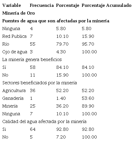 La mayoría de los participantes mencionaron que la minería genera beneficios y que los sectores más favorecidos son los de agricultura y minería (tabla 7), esto concuerda con Willer y Takahashi (2018), quienes mencionan que la minería genera desarrollo en los pueblos de las zonas donde se establece, pero que se deben considerar los riesgos desde los inicios de la explotación, debido al daño ambiental que las operaciones artesanales generan indirectamente (Amoakwah et al., 2020). Esto coincide con la percepción social de los pobladores sobre los impactos de la minería en Ollachea, ya que el 79.7% de los encuestados opinan que el río Osccocachi es el más afectado, esto con coincide con el estudio de Withanachchi et al. (2018), quienes determinaron que el 63.8% de la población de estudio indica que la minería es la principal causa de contaminación de los recursos hídricos, percibiendo un riesgo para la salud. Asimismo, Yirenkyi-fianko y Yanful (2020) indican que un gran porcentaje de la población percibe que las fuentes de agua cercanas o precedentes de la actividades mineras se encuentran contaminadas y son inseguros para el consumo humano y/o uso doméstico.