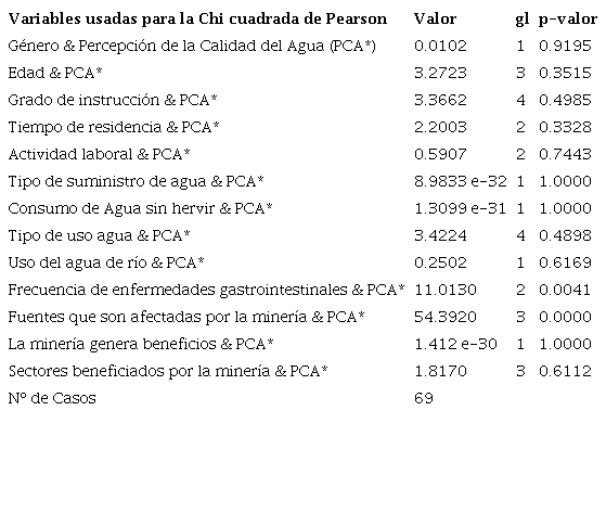 En la tabla 8 se presentan los resultados de la prueba chi-cuadrado de Pearson que verificaron la asociación entre las variables sociales y la percepción sobre la calidad del agua. La variable “fuentes que son afectadas por la minería” presenta una fuerte asociación con la “percepción de la calidad del agua”, ya que los pobladores podrían relacionar el desarrollo de las actividades mineras artesanales con la contaminación directa de las fuentes hídricas cercanas tal y como se demuestra en el estudio realizado por Gilsbach et al. (2019), quienes señalan que la minería está fuertemente asociada con el impacto del recurso hídrico por la mala gestión que realizan en sus operaciones. Así mismo, la “frecuencia de las enfermedades gastrointestinales” tiene una fuerte relación con la “percepción de la calidad del agua del río”, lo que indicaría que la población percibe que las enfermedades gastrointestinales que padecen están siendo generadas probablemente debido a la contaminación procedente de la minería, sugiriendo que la minería altera negativamente la calidad del agua, coincidiendo con el estudio de Bessah et al. (2021), el cual menciona que la inadecuada calidad del agua de los ríos aledaños a la actividad minera es inutilizable a pesar de su disponibilidad, desde la percepción de los pobladores.