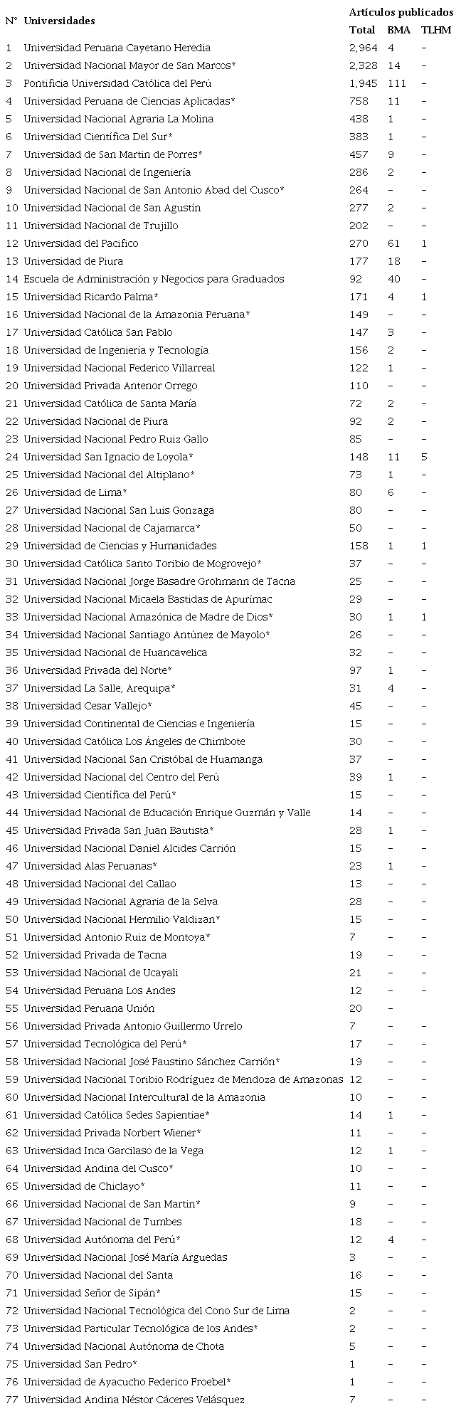 Según el SIR-IBER del año 2018, 77 (53.84%) universidades peruanas de las 143 autorizadas a esa fecha por la Superintendencia Nacional de Educación Superior Universitaria (SUNEDU), han publicado sus resultados de investigación en revistas indizadas en la base de datos de Scopus en diferentes áreas del conocimiento. A continuación, en la tabla 1 se muestra la lista de estas universidades peruanas, donde se incluye la cantidad total de publicaciones indizadas en Scopus en el periodo 2008-2018, la cantidad de artículos en el área de Business, Management and Accounting (BMA) y la categoría de Tourism, Leisure and Hospitality Management (TLHM).