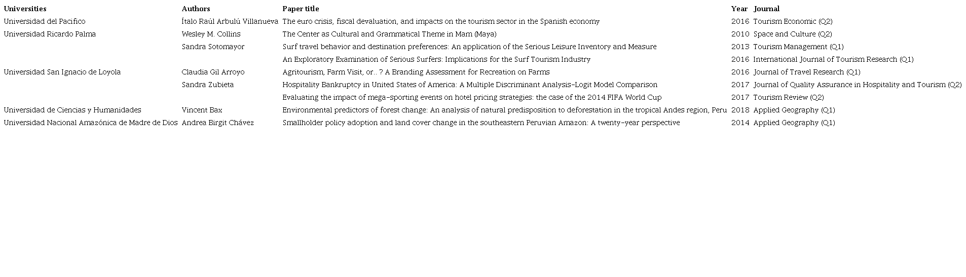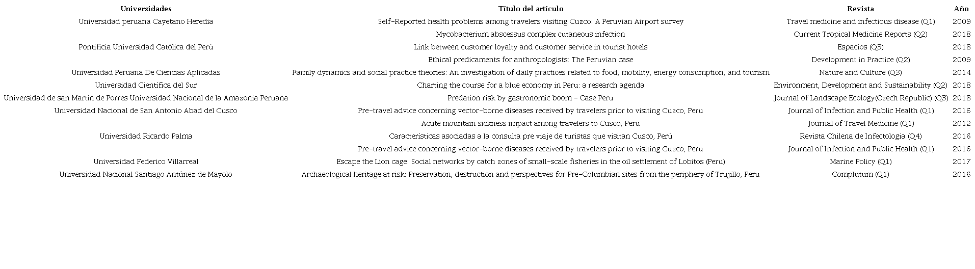 En la Tabla 5, se presentan una relación de artículos científicos, publicados por universidades peruanas, relacionados al campo del turismo y publicados en revistas indizadas en Scopus en una categoría distinta a la de Tourism, Leisure and Hospitality Management.
