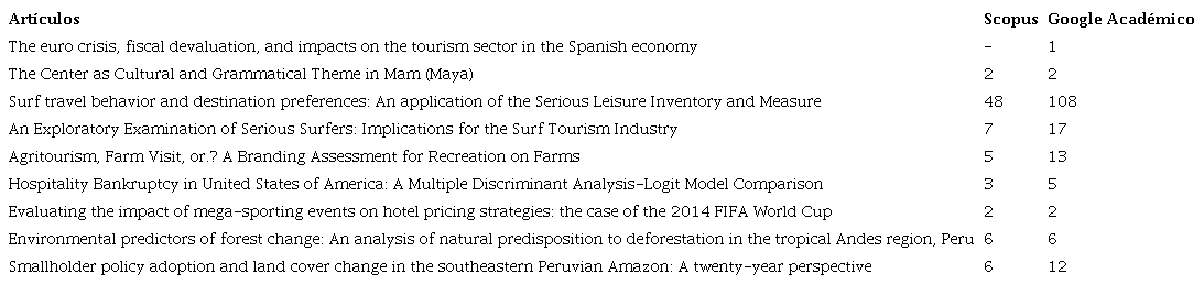 Con relación al impacto de los artículos, “Surf travel behavior and destination preferences: An application of the Serious Leisure Inventory and Measure”, que tiene como autora a Sandra Sotomayor, docente de la Universidad San Ignacio de Loyola-USIL, es el que presenta mayor impacto con un alto número de citas, por encima del promedio, tanto en Scopus como en Google académico (Tabla 3).