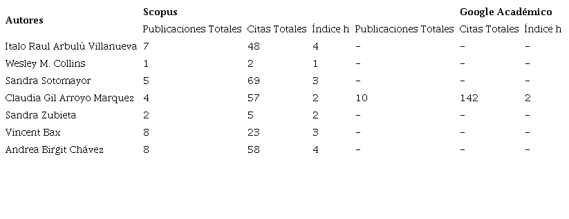 Para el caso de la producción e impacto, la mayoría de los autores presentan un índice h ( 2, esto para el total de sus artículos publicados en diversas áreas en Scopus. Italo Raul Arbulú y Andreas Birgit Chávez, son los autores con mayor índice de impacto en todas las áreas de publicación, a diferencia de ellos, Sandra Sotomayor es la mejor posicionada como autora de universidades peruanas, dado que casi todos los artículos que ha publicado encuentra con filiación de la USIL. Cabe mencionar, que muchos de los autores no se aparecen en Google Académico, porque a lo contrario de la base de datos de Scopus, que genera automáticamente un código y se incluye al autor, en Google Académico el investigador se tiene que registrar (Tabla 4).