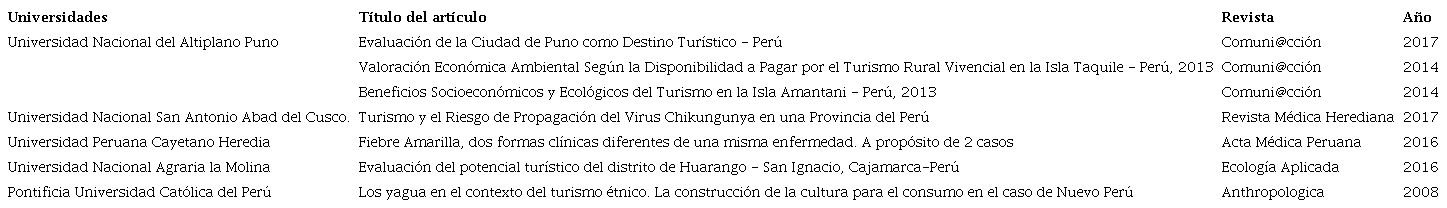 En la Tabla 6, se muestran una relación de artículos, relacionados al campo del turismo, publicados por autores de universidades peruanas en revistas indizadas en la base de datos de Scielo.