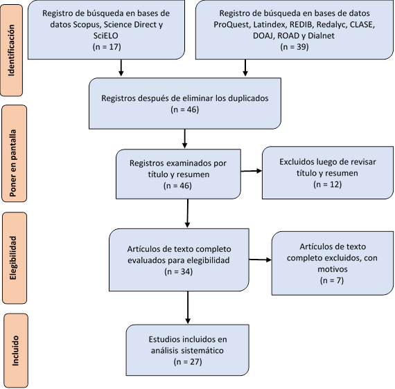 A continuación, se descartaron 10 artículos duplicados, ya que algunas revistas publican los artículos en dos o más bases de datos; quedando un total de 46 registros. Continuando con el proceso de elegibilidad se excluyeron 12 referencias que no cumplían con los criterios definidos para el título y resumen. Los 34 artículos científicos que resultaron fueron leídos para confirmar la elección. Finalmente, se descartaron 7 artículos de acuerdo a motivos, quedando 27 artículos para la realización del análisis sistemático, como se observa en la Figura 1.