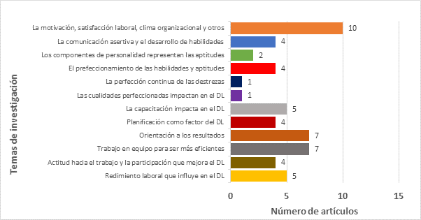 En resumen, se logra señalar que los temas que más se investigaron en referencia al DL son: 1) la motivación, satisfacción laboral, clima organizacional y otros; 2) trabajo en equipo para ser más eficientes y 3) orientación a los resultados. En relación a los temas menos estudiados, se describieron los siguientes: 1) las cualidades perfeccionadas impactan en el DL; 2) la perfección continua de las destrezas y 3) los componentes de personalidad representan las aptitudes.
