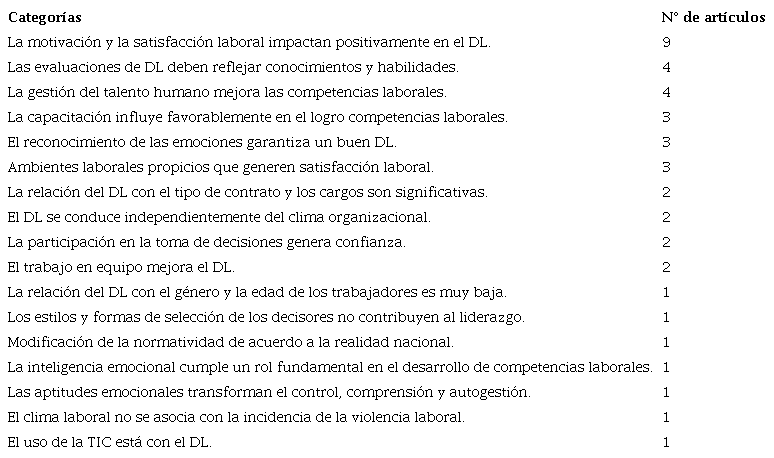 En los artículos revisados se encontraron una serie de resultados, aporte o conclusiones referidos a gestión de los recursos humanos. Asimismo, se reconocieron una determinada cantidad de propuestas sobre el DL; los mismos que se caracterizaron y se clasificaron por la cantidad de veces que tuvieron su aparición. Esto es, por cada categoría aparecida, se detalla la cantidad de estudios en que se muestra (ver Tabla 1).