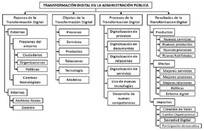 Sin embargo, la transformación digital podría menoscabar la accesibilidad y calidad de los servicios; pero, aun así, es una oportunidad para mejorarlos, ya sea en su eficiencia, ya sea en su eficacia (Dobrolyubova et al., 2019; Carrera-Mora et al., 2019; Alvarenga et al., 2020; Reier y Garay, 2021; Aminah y Saksono, 2021; Andersson et al., 2022). Esta transformación, si bien debe acelerarse, debe estar normada y planificada, para dar un marco adecuado y óptimo al uso de las tecnologías digitales. Empero, el resultado de este proceso puede influir a favor o en contra de la administración pública; sobre todo, porque están en juego las prácticas democráticas (Aguirre, 2021).