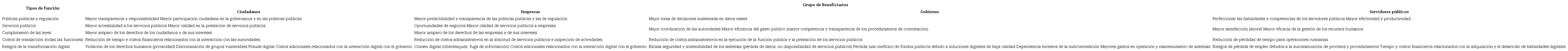 En su momento, la OCDE (2020) propuso una medida alternativa, denominada Índice de Gobierno Digital (DGI), diseñada para guiar y monitorear la implementación de sus recomendaciones. Comprende seis dimensiones (digital por diseño; gobierno como plataforma; administración pública basada en datos; abierto por defecto, usuario proactivo; y proactividad); asimismo, dicho organismo internacional proporciona datos actualizados sobre la implementación de la gobernanza digital de los países. Asimismo, Dobrolyubova (2021) clasifica los efectos positivos y los riesgos de la transformación digital por tipos de funciones y grupos de beneficiarios (Tabla 1). Esta clasificación puede ser útil para cuantificar el valor de la digitalización de los servicios públicos; verificar su rendimiento; y construir indicadores para realizar un análisis cualitativo y una evaluación cuantitativa de los datos a obtener.