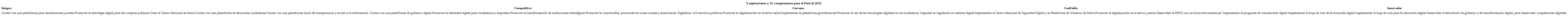Complementariamente, en octubre del 2020, se hizo público el diseño de la Política Nacional de Transformación Digital - PNTD. Esta política se sustenta en 4 pilares: i) conectividad digital; ii) educación digital; iii) gobierno digital; y, iv) economía digital con enfoque territorial, emprendimiento e innovación. Estos pilares están respaldados por: a) la gobernanza de datos; b) la seguridad digital; c) el talento y la innovación digital; y, d) una transformación cultural. Asimismo, la PNTD se soporta y aprovecha la inteligencia artificial, el govtech, la confianza digital y la resiliencia digital. En ese mismo año, la SGTD trazó una hoja de ruta para transformar digitalmente la administración pública. La denominó Agenda Digital al Bicentenario. En ella se establecen estrategias, metas y acciones para lograr un Perú transparente, competitivo e innovador, y hacer viable una mejor convivencia social. Esta agenda contiene 21 compromisos, agrupados en 5 aspiraciones (Tabla 3).