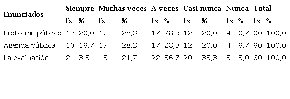 Los ciclos de las políticas públicas no se aplican adecuadamente en las instituciones del Estado; del total de entrevistados, 17 representantes sostienen que a veces son considerados en la gestión e implementación para resolver problemas públicos, lo que representa el 28.3%. Del mismo modo, 17 representantes hacen el 28.3%, que consideran la categoría muchas veces, quienes toman en cuenta los problemas públicos para identificar necesidades. En cambio, el 20.0% de informantes, consideran la variable casi nunca y 6,7% nunca, esto implica, que la mayoría de los representantes de la sociedad civil, funcionarios, medios de comunicación y empresarios consideran los problemas públicos para satisfacer las necesidades en diferentes sectores de la sociedad.