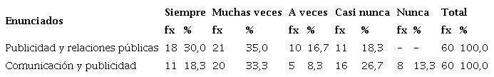 En la comunicación social y la publicidad, juegan un papel importante en las relaciones públicas. Los informantes consideran la variable muchas veces, la publicidad y relaciones públicas son utilizadas por las instituciones del Estado para promover el desarrollo del turismo y representa el 35,0%. Del mismo modo, los representantes que afirman siempre, al respecto, son el 30,0%. Los que indican, casi nunca el 18,3%, y finalmente, los que manifiestan a veces, representa el 16,7%. Esto implica que la mayoría de los entrevistados consideran útil la publicidad y las relaciones públicas para mejorar la gestión pública en las instituciones para el desarrollo del turismo en la Provincia de Puno. La comunicación y publicidad contribuyen a mejorar las estrategias de intervención en la gestión pública, del total de entrevistados, el 33,3% consideran muchas veces, este proceso, mientras el 26,7% indican, casi nunca. Otros entrevistados afirman que, siempre representando el 18,3%, a diferencia de los que indican, nunca el 13,3% y, a veces el 8,3%. Esto nos da a conocer que la mayoría de los entrevistados aceptan la necesidad de utilizar la comunicación y la publicidad, para implementar estrategias de la gestión pública para promover el desarrollo de turismo en la Provincia de Puno. Al respecto Alonso, (2007), afirma “los soportes publicitarios, constituye la acción comunicativa publicitaria, a través de la creatividad, recepción y mensaje adicional mediante la sinergia del plan de medios” (pág.181).