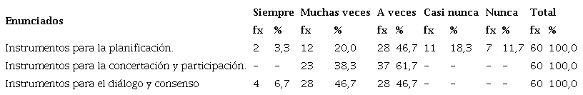 De 60 entrevistados, el 61.7% consideran, a veces, y, el 38,3% muchas veces. Sin embargo, los otros informantes, no opinan respecto a la importancia de la concertación y participación como instrumento de gestión de las políticas públicas. Ahora bien, respecto al diálogo y consenso como instrumento de gestión de las políticas públicas, los entrevistados manifestaron la condición a veces que representa el 46,7% y los que indican muchas veces, constituyen el 46,7%. Sin embargo, los que afirman, la categoría siempre, son el 6,7% respectivamente. Esto implica que mayoría reconocen importante el dialogo y el consenso para impulsar el desarrollo local, a través de la participación ciudadana y mejorar la calidad de vida, mediante la actividad turística en la provincia de Puno.