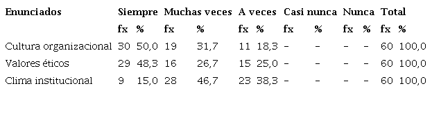 Los entrevistados consideran, siempre, la práctica de los valores éticos lo que constituye el 48,3%. En la misma medida, los representantes manifiestan, muchas veces, la importancia de los valores éticos que representa el 26,7%. Otros interrogados defienden, a veces, porque ponen en practican los valores éticos, los que suman el 25,0%. Los funcionarios perciben un clima institucional inadecuado, por la actitud de sus trabajadores. Sin embargo, los entrevistados manifiestan, muchas veces, tienen conocimiento del clima institucional y representa el 46,7%. Del mismo modo, los informantes que manifiestan, a veces bordean el 38,3%. Otros entrevistados consideran, siempre, lo que constituye el 15,0%. Esto involucra que algunos trabajadores no cumplen con sus funciones adecuadamente, faltando al compromiso y ética deontológica.