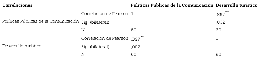 Los resultados según el SPSS, consideran un valor del coeficiente de correlación de Pearson igual a + 0.397**. Por consiguiente, existe una correlación positiva entre ambas variables a un nivel de error del 0.05 o 5%, el cual se demuestra el mayor grado de relación entre políticas públicas de la comunicación y desarrollo turístico en la provincia de Puno.