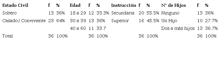 En la Tabla 1, se observa las condiciones de los participantes; en lo que destaca una alta afluencia de personas jóvenes, con el mínimo grado de instrucción, que viven en pareja ya sea por matrimonio o convivencia, la función de vigilancia a pie y la presencia de uno a más hijos dependientes de manutención.