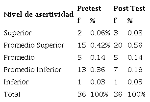 En la Tabla 3, se presentan la comparación de los niveles de asertividad pre y post intervención, con mayor incremento en el nivel promedio superior y disminución de participantes en el nivel promedio inferior.