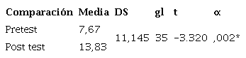 En la Tabla 4, se observan diferencias significativas ante la comparación pre y post intervención, con un puntaje t= -3.320, y p=,002.