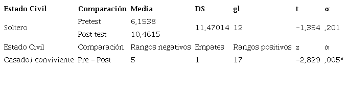 En la Tabla 5, respecto al estado civil, los participantes solteros presentan un puntaje t = -1,354 y p=,201, y los participantes casados/convivientes, una puntuación z de -2,829 y p=,005, que confirma diferencias significativas, solo en quienes viven en pareja.
