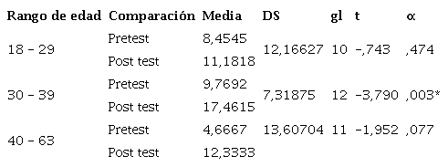 En la Tabla 6, respecto al rango de edad, los participantes de 18 a 29 años alcanzaron un puntaje t = -,743 y p=,474; los de 40 a 63 años un puntaje t = -1,952 y p=,077; y en los participantes de 30 a 39 años un puntaje t=-3,790 y p=,003; observando, que los adultos intermedios fueron los únicos con cambios significativos en su asertividad pre y post test.