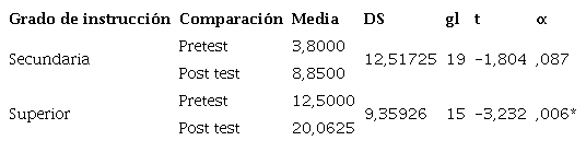 En la Tabla 7, respecto al grado de instrucción, los participantes con instrucción secundaria denotaron un puntaje t = -1,804 y p= ,087, y los participantes de instrucción superior, una puntuación Z de -3,232 y p=,006, que implica que los de instrucción secundaria no obtuvieron diferencias significativas pre y post test.
