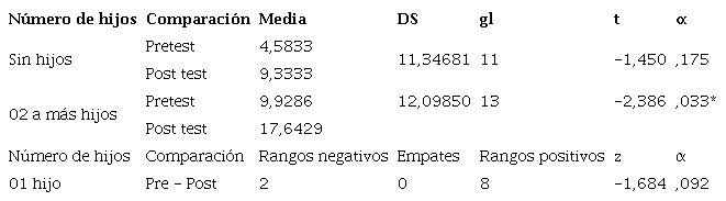 En la Tabla 8, respecto al número de hijos, la comparación pre y post test indica un puntaje t = -1,450 y p=,175, para los participantes sin hijos; respecto a quienes tienen un hijo la puntuación z de -1,684 y p= ,028, y quienes tienen de 2 o más hijos el puntaje t de -2,386 y p=,033, lo que indica que, existen diferencias entre el pre y post test en personas con 2 o más hijos.