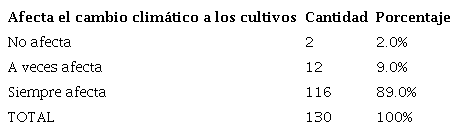Es por ello, como distintos factores en la producción agrícola influye en los ingresos de los agricultores, en este sentido en la tabla 3 se analiza el factor cambio climático.