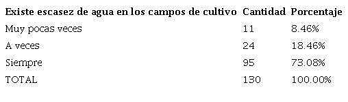 El agua es elemento fundamental para la agricultura, en tal sentido se identificó que en los terrenos de cultivo de las familias agricultoras en la región Amazonas existe escasez de agua en los canales de irrigación, de los cuales el 73.08% mencionan tener este problema, así mismos mencionan que en tiempos de sequía dichos canales llegan a secar, lo cual afecta sin lugar a dudas los cultivos.