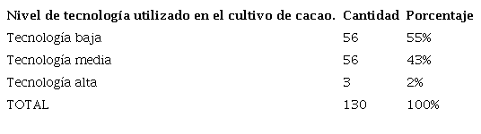 Las actividades de producción de los agricultores en la región Amazonas se desarrollan bajo una tecnología tradicional, por no llamarlo una tecnología de subsistencia. En estos contextos la tabla 6 muestra claramente que el 55% de los productores afirman estar utilizando un nivel de tecnología baja, y el 43% cree estar utilizando un nivel de tecnología media y solo el 2% afirma estar utilizando un nivel de tecnología alto.