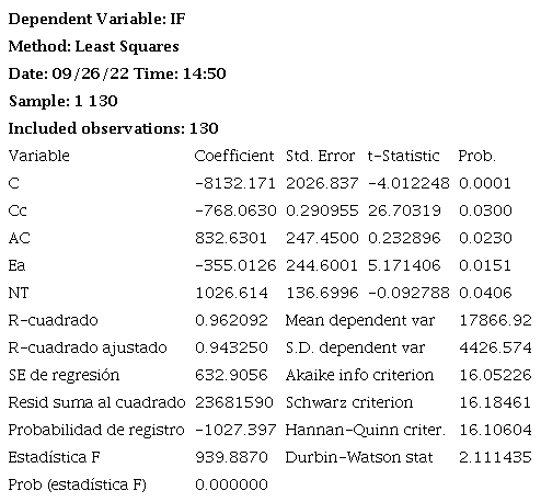 𝐼𝐹 = 𝛽0 + 𝛽1Cc+ 𝛽2𝐴𝑐 + 𝛽3Ea + 𝛽5𝑁𝑡 + 𝑒