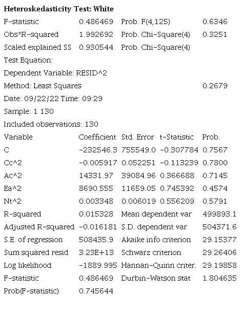 Con el fin de evaluar el supuesto de homocedasticidad, que en el modelo de regresión lineal esta palabra significa misma dispersión o igual dispersión, es decir que la varianza de los errores es constante en todas las observaciones. Caso contrario si la varianza de los errores no es constante en todas las observaciones realizadas, se dice que el modelo presenta problemas de heterocedasticidad (Chanquey et al., 2021). Para detectar el problema de heteroscedasticidad existen muchos métodos, el más común es realizar el Test de White, que plantea las siguientes hipótesis: hipótesis nula, el modelo es homocedástico, hipótesis alternativa, el modelo es heterocedástico.