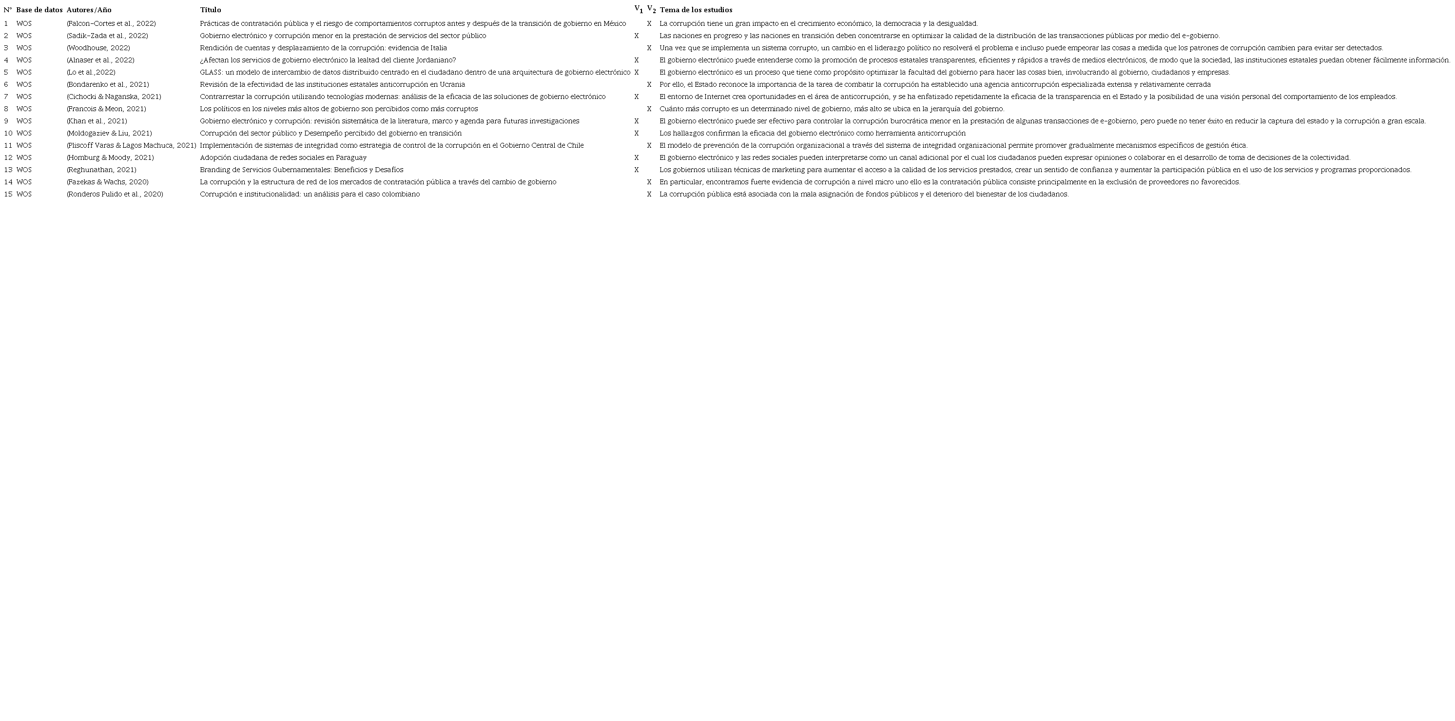 En la tabla 1 y 2, se describen las principales propiedades de los artículos elegidos. Como son base de datos, autor/año, título del artículo, y finalmente la temática de cada uno de los artículos de revisión. En la plataforma de WEB OF SCIENCE se hallaron 15 artículos (50%) y en SCOPUS 15 artículos (50%). En términos generales de los 30 artículos seleccionados para su revisión. El 43% corresponde a la V1 gobierno electrónico con 13 investigaciones y el 57% para la V2 corrupción con 17 artículos.