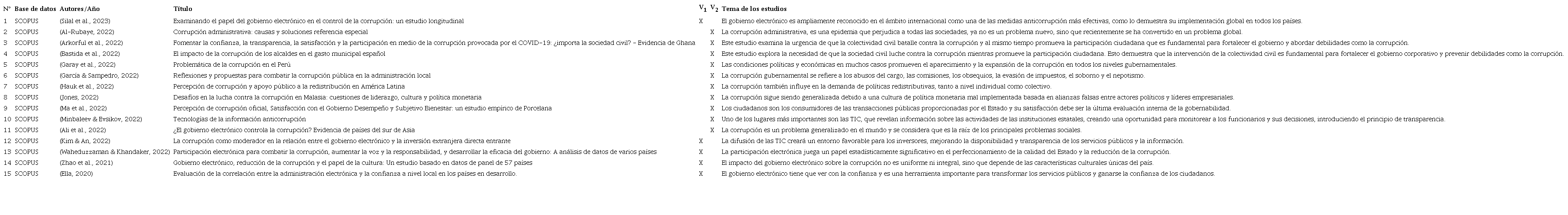 En la selección de la información se usaron las plataformas de WEB OF SCIENCE y SCOPUS, el tiempo de indagación se delimitó del 2020 al 2023. Se examinaron estudios de diferentes naciones, en español e inglés. El proceso de selección evaluó a partir de los factores que se relacionan con las variables, estudios con un enfoque cualitativo y cuantitativo. En la plataforma SCOPUS se hallaron 15 artículos, mientras que en WEB OF SCIENCE, se hallaron 15 estudios que obedecieron a los principios de inclusión para su análisis. Para la inclusión de los estudios se estableció la valoración científica sobre el e-gobierno y la corrupción a nivel gubernamental. Del período de investigación (2020 - 2023). Se eligieron estudios de revistas indexadas con información reciente y resultados relacionados con la investigación. Asimismo, se examinaron los objetivos del artículo y se descartaron aquellas sin palabras clave. La primera depuración se llevó a cabo mediante la lectura de los títulos, resúmenes, métodos; investigaciones de acceso abierto y de texto completo. Utilizando orientaciones de métodos cuantitativos y cualitativos en inglés y español.
