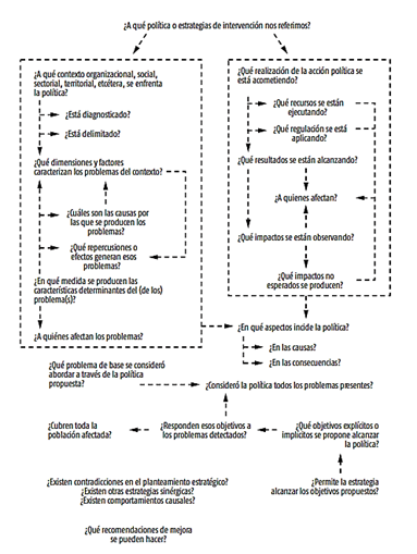 En términos generales, la elaboración e implementación de las mencionadas políticas sigue un proceso lineal desde su planificación hasta su efectiva aplicación; siendo que deben contener objetivos, lineamientos de aplicación e instrumentos para concretar los primeros, lo que incluye financiación, materiales y capital humano (Bardach, 1998, p. 25). Una vez determinada la política pública, la misma será evaluada para determinar si satisface el objetivo público elegido. En el cuadro siguiente se observa los ocho pasos que deben ser evaluados. Primero debe pretender brindar respuesta al problema, luego identificar el momento temporal en el que se realiza la evaluación de la acción política, el gestor que promueve la evaluación de manera individual o conjunta, el papel del gestor y el objeto de análisis de la política (1998, p. 30).