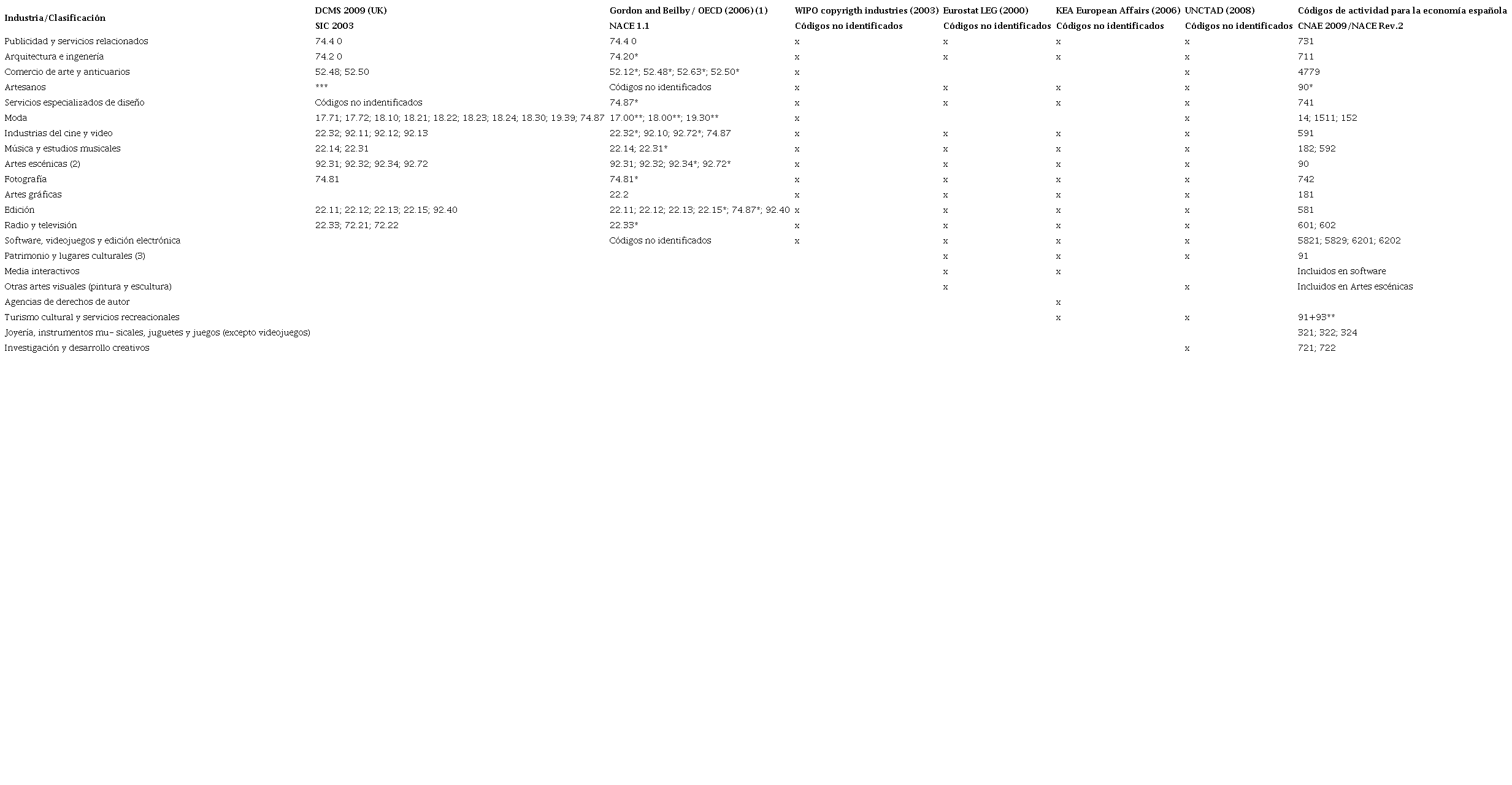 En esa línea, Boix & Lazzeretti presentan una tabla de industrias creativas en las que se observa las manifestaciones de moda, comercio de bienes creativos, publicidad, diseño especializado, fotografía, cine, video y música, investigación y desarrollo creativos, escritores, artes escénicas, artes visuales, artesanos, etc.