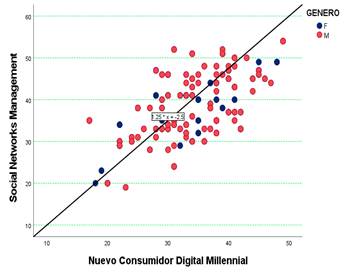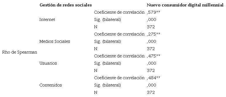 Finalmente, se evidencia correlación positiva entre las dimensiones de la gestión de redes sociales y la variable nuevo consumidor digital millennial.