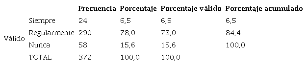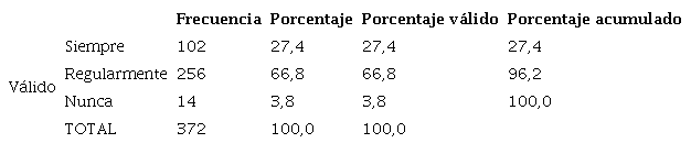 En Tabla 1 se aprecia que los consumidores digitales pertenecientes a la generación millennial usan habitualmente las redes sociales e Internet para interactuar con contenidos y llevar a cabo procesos de compra exitosos. En efecto, se puede constatar que 256 consumidores digitales, lo que equivale al 66.8 %, utilizan regularmente la gestión de redes sociales para realizar compras en línea. En contraste, 102 consumidores digitales, que representan el 27.4 %, indicaron que lo usan siempre, mientras que 14 millennials, representando el 3.8 %, no lo utilizan en absoluto.