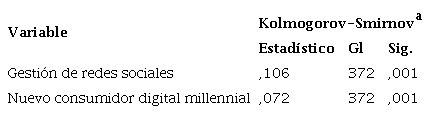 Según los resultados obtenidos en la tabla 3 de la prueba de normalidad, se observa que el P1=,001 para la variable "gestión de las redes sociales" y p2=,001 para la variable "nuevo consumidor digital millennial", donde (n ≥ 50). Estos valores indican que la distribución de datos no sigue una distribución normal. Por lo tanto, la hipótesis será analizada mediante una prueba no paramétrica, y se utilizará el coeficiente de correlación de Rho de Spearman.