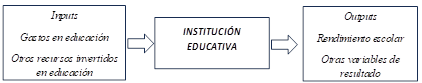 Según la teoría microeconómica, es el productor quien maximiza los beneficios, minimizando sus costos sujetos a restricciones y obteniendo la mayor cantidad de producto (Nicholson & Snyder, 2015). El sistema educativo de acuerdo a esta teoría (Aturupane, 2017), transforma los insumos (inputs) en los productos (outputs). Siendo el objetivo de la educación básica regular. “priorizar la educación básica de calidad, promover una gestión educativa eficiente y descentralizada, y otros” (MINEDU, 2022). Lo que busca la función de producción educativa es relacionar varios insumos (inversión pública, número de estudiantes por maestro, infraestructura, servicios básicos, entre otros) (Soleimanipirmorad & Vural, 2018), que influyen en los resultados educativos (logros en comunicación y matemática), evidenciados en los resultados de pruebas estandarizadas (Oluwatayo et al., 2023). La institución educativa es la encargada de llevar a cabo el proceso de transformación, como se muestra a continuación (Hien, 2018).