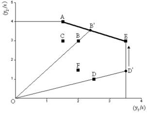 Entendiendo el éxito de una organización como el logro del máximo producto o servicio con un coste dado originado por una combinación específica de factores (orientación output) (Hamsahtun Siregar & Aceh, 2021). Siendo la metodología no paramétrica la más adecuada para su medición (Cristóbal et al., 2021), a través de DEA basada en la obtención de una frontera de eficiencia a partir del conjunto de observaciones que se considere sin necesidad de conocer ninguna forma de relación funcional entre inputs y outputs (Tong Soo, 2019), en el contexto de eficiencia técnica, la eficiencia de la función de producción de educación se puede observar en la siguiente figura: considera 1 inputs (x) y dos output (y1,y2) (Ji & Lee, 2010). Las regiones A y E son eficientes técnicamente, las regiones que permanecen por debajo de la frontera eficiente son calificadas como regiones ineficientes técnicamente.