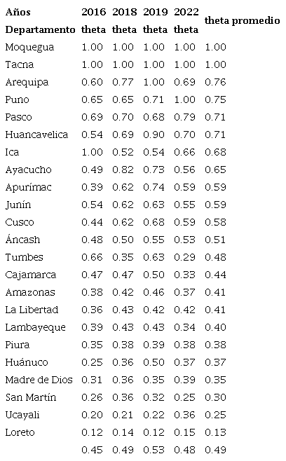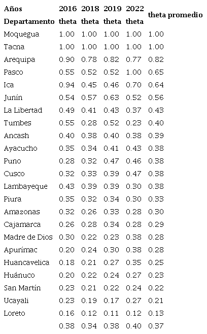 Respecto de los resultados en el nivel secundario (tabla 3), a nivel de las regiones del Perú para el 2016 el promedio de eficiencia técnica es de 0.38, en tanto que para el 2018, 2019 y 2022 se estima en 0.34, 0.38 y 0.48 respectivamente, al igual que el nivel primario no se estimó la eficiencia técnica para el año 2017, 2020 y 2021.