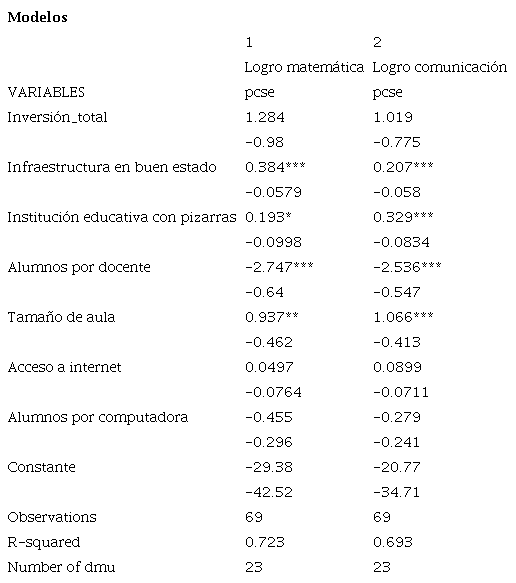 Respecto de la relación insumo producto, se encontró que la inversión pública influye de manera positiva en el logro de los aprendizajes de comunicación y matemática, sin embargo, esta resultó no ser significativa, concordando con (Sallaberry et al., 2022), quien encontró que la inversión pública sí tenía influencia sobre el logro en el cumplimiento de los objetivos educativos, y (W. Yu & Ma, 2022), quien indica que existe margen de mejora en la asignación de la inversión pública hacia el sector educativo.