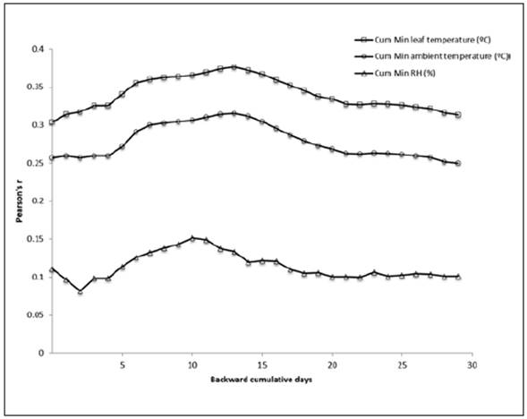 The analysis of the influence of the climatic conditions previous to the evaluation date showed that the Cumulative Minimum ambient temperature, the Cumulative Minimum leaf temperature and the Cumulative Minimum relative humidity have a positive correlation with the presence and damage caused by M. velezangeli. This correlation reached a maximum in correspondence with the backward cumulative data of the 12 days prior to the assessment (Pearson's r Cum Min AT = 0.37; Pearson's r Cum Min LT = 0.31; and Pearson's r Cum Min RH = 0.14, respectively), indicating that the activity of M. velezangeli was favored when the ambient and leaf minimum temperatures and also the minimum humidity records throughout the 12 days previous to the evaluation were not extremely low (Figures 1 and 3).